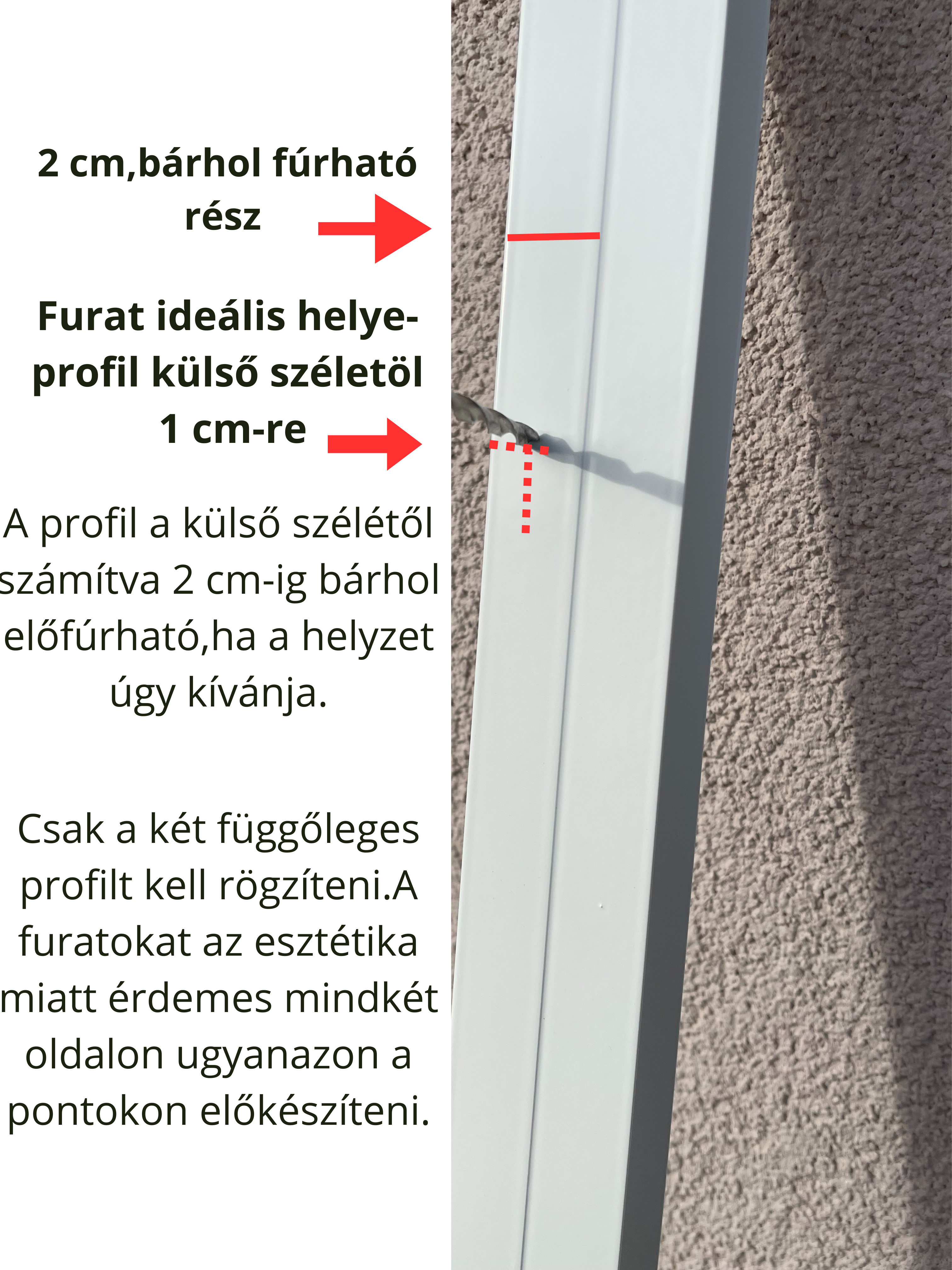Természetesen az esztétika miatt érdemes a közepén,tehát a profil külső szélétől számolva 1cm-re,a szerkezet tetejétől és az aljától számolva pedig 15-20cm-re előkészíteni a furatokat.